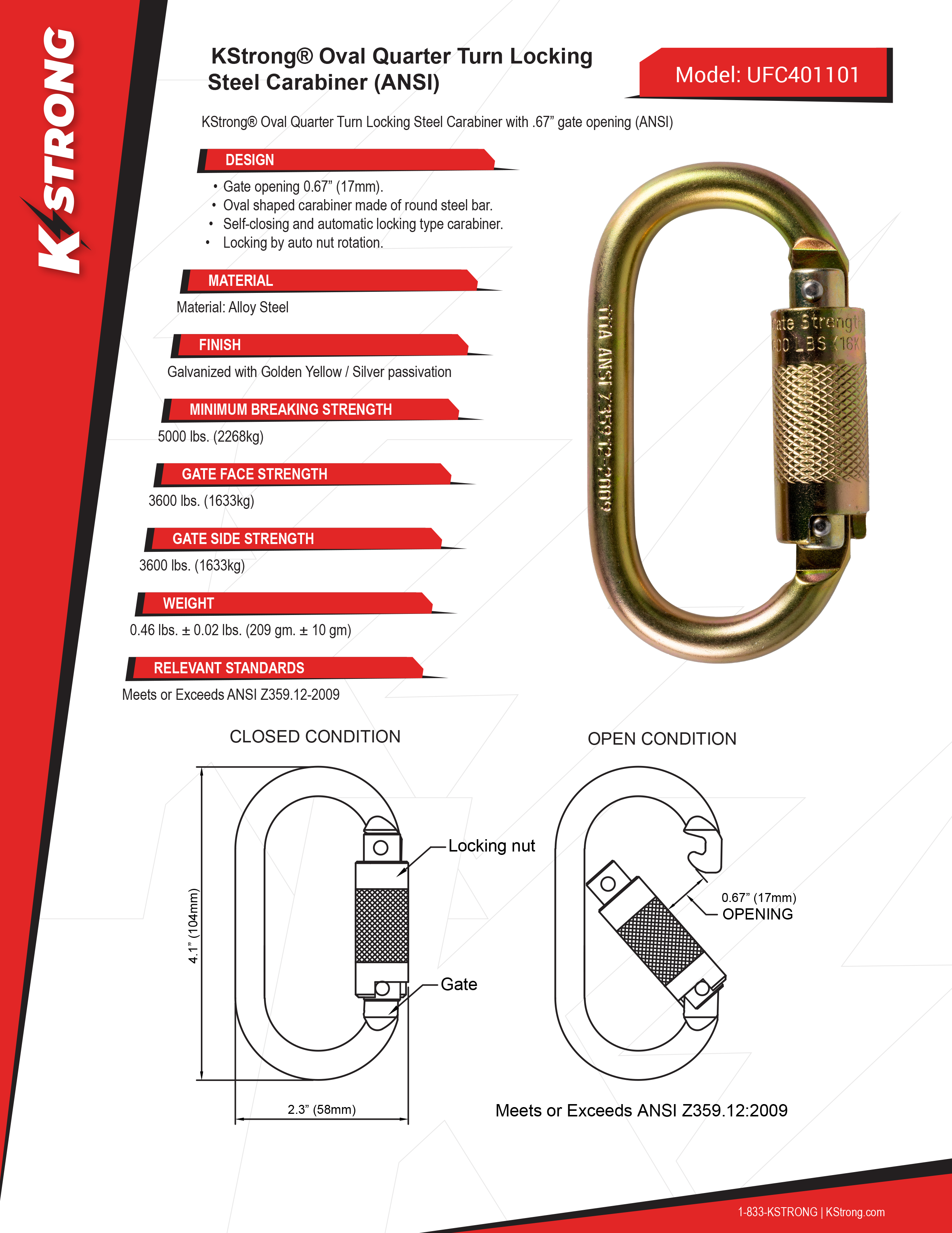KStrong® UFC401101 - Oval Quarter Turn Locking Steel Carabiner .67″ Gate Opening (ANSI)