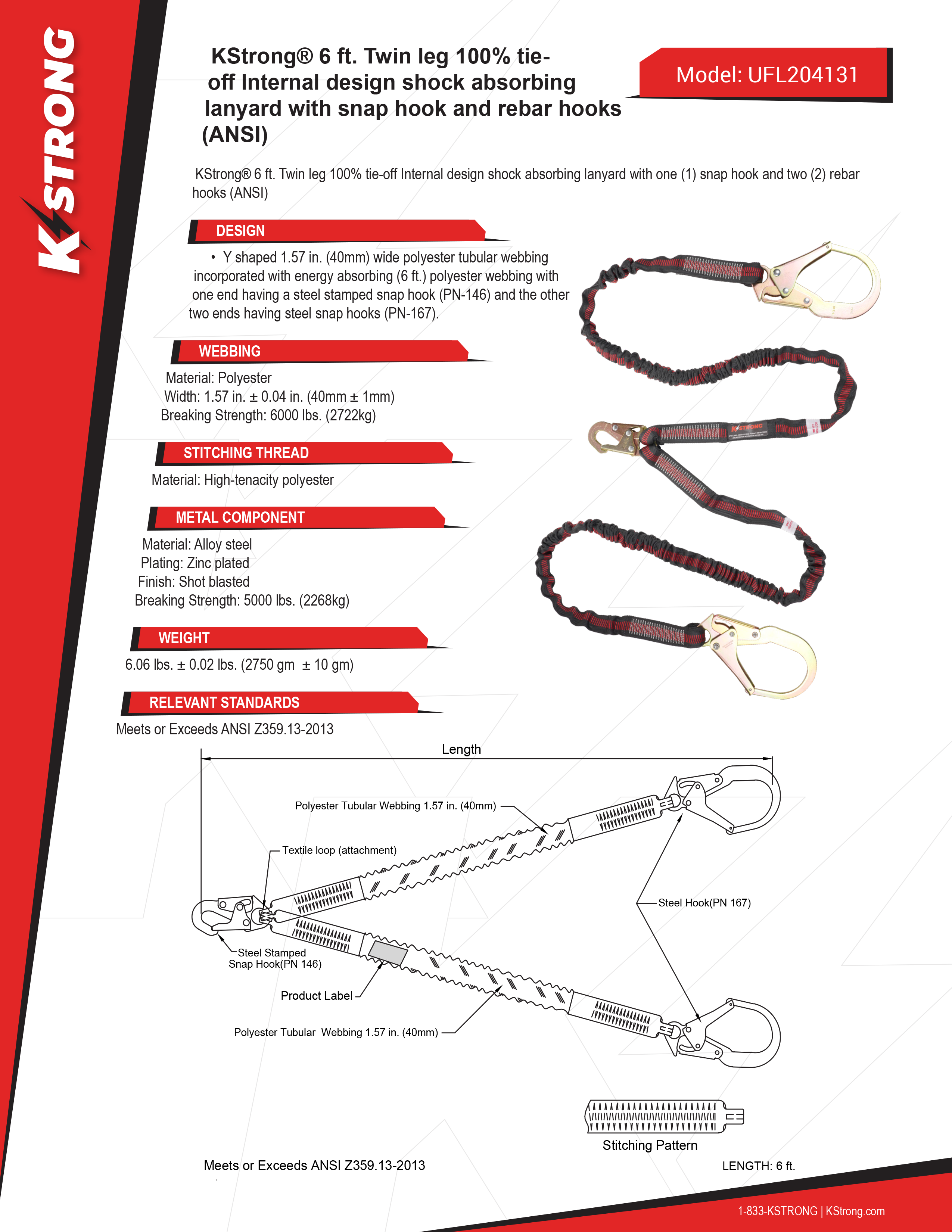 KStrong® UFL204131 - 6 ft. Twin leg 100% Tie-Off Internal Design Shock Absorbing Lanyard with (1) Snap Hook and (2) Rebar Hooks (ANSI)