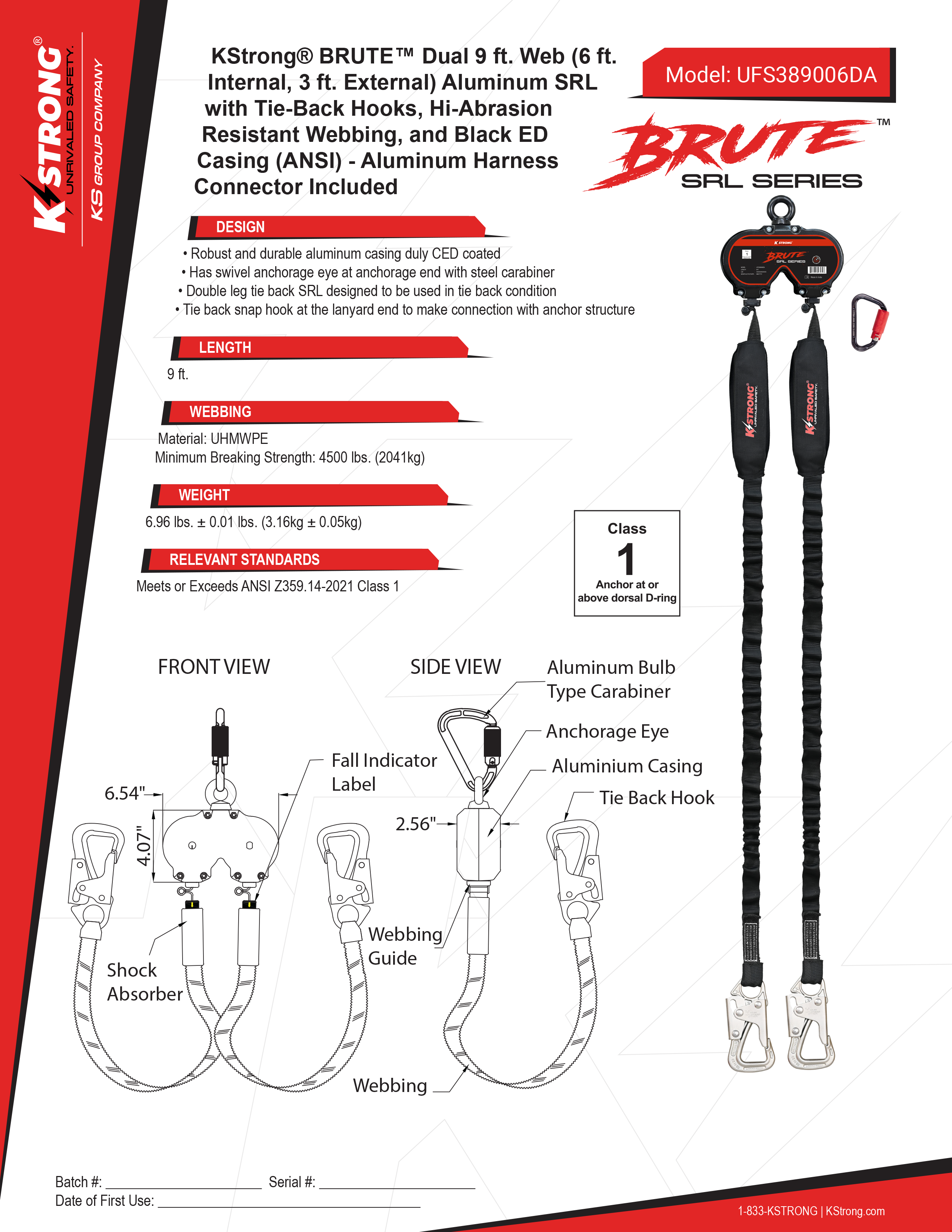 KStrong® UFS389006DA - BRUTE™ Dual 9 ft. Web (6 ft. Internal, 3 ft. External) Aluminum SRL with Tie-Back Hooks, Hi-Abrasion Resistant Webbing, and Black ED Casing (ANSI) – Aluminum Harness Connector Included.